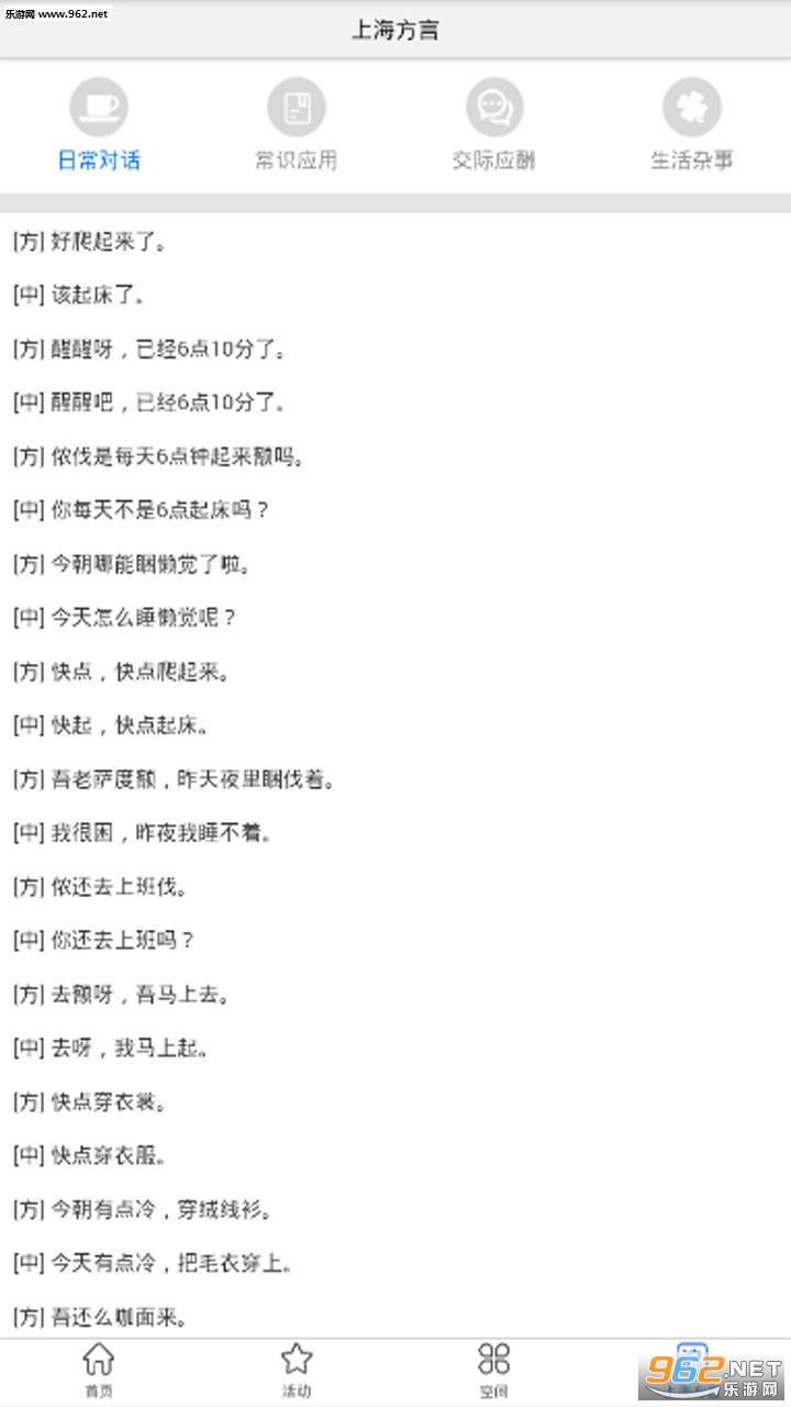 提供一个学习上海话的模块,帮助来沪的外地人,外国人学习上海话。该模块分为日常对话、常识应用、交际应酬和生活杂事。