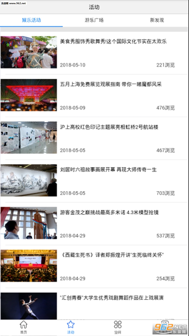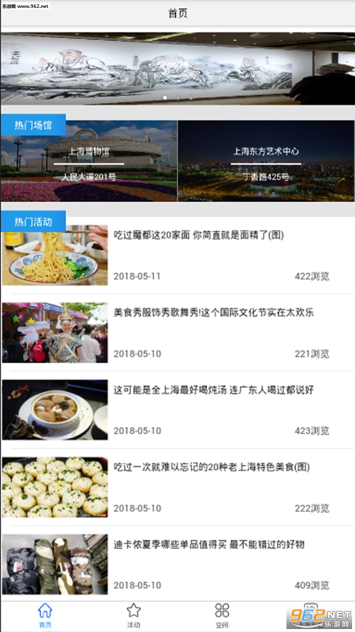 提供上海近期的一些精选活动资讯,活动咨询分三个类目,分别是娱乐活动、游乐广场和新发现。包括演出、展览、比赛、讲座、赛事;热门景点、场馆、户外旅游;美食、购物等等。