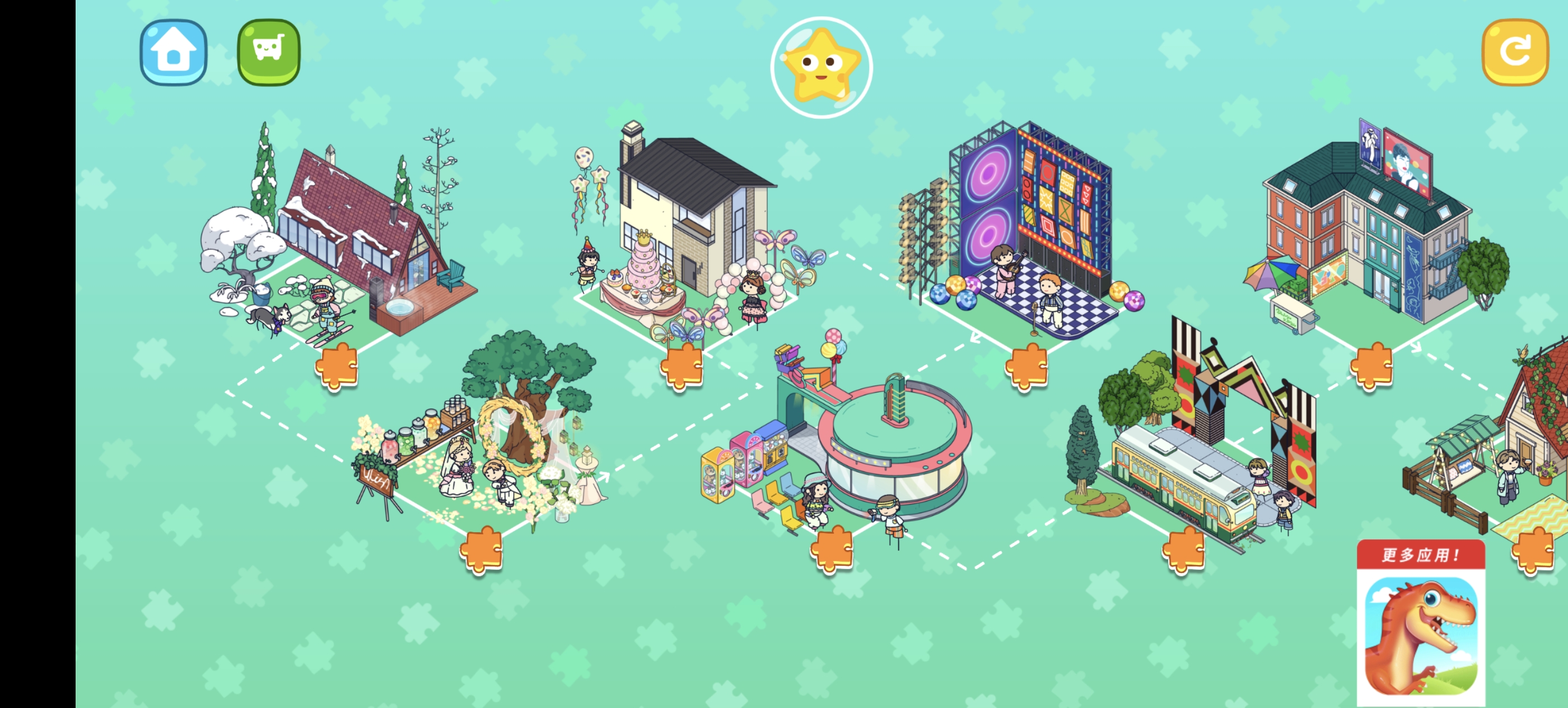 21个迥异拼图世界:从繁华的商区到神秘的魔法学校,从刺激的滑雪场到宁静的海滨婚礼,每个拼图世界都独具特色,让小朋友们在探索中不断成长。
