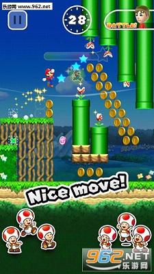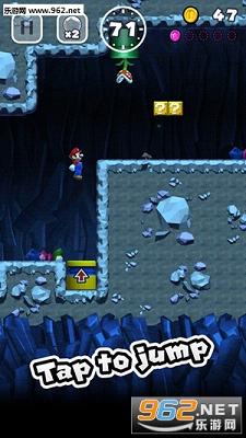 值得一提,马里奥一旦奔跑起来就不会停止,除非当你踩到下方的暂停按钮,此时你可以休息片刻来考虑而后的奔跑计划。总体来讲玩起来很容易上手的,玩家可以通过点击屏幕来控制马里奥的跳跃,按的时间越长跳的就会更高一些,当然,这跳跃高度也是有最高上限的,虽说不会有二段跳,但一旦碰到墙壁等建筑就可以再次朝任何方向跳跃,玩家只需滑动屏幕来操作。