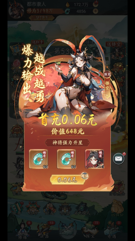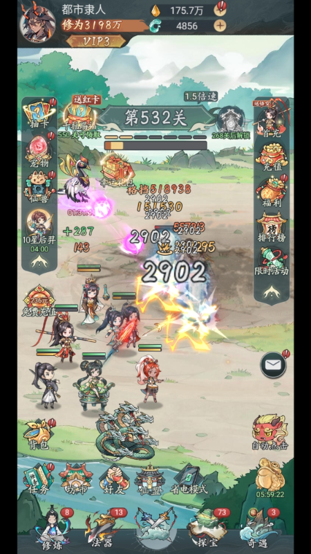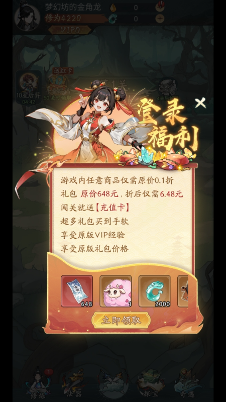 丰厚福利:游戏内设有多种福利活动,如每50关送10连红将、上线送永久福利卡等,让玩家在修仙的道路上更加轻松。