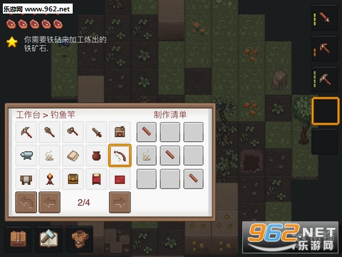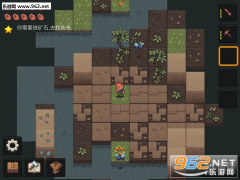 于第一次进入游戏的玩家,游戏中将会提供玩家教程,玩家可以跟着教程慢慢熟悉游戏中的主要玩法与操作,在游戏中玩家通过点击屏幕的放是控制角色的移动,不得不吐槽,这样的操作方式实在是太不方便了,如果可以换成虚拟摇杆在操作体验上会得到更大的提升。玩家可以在教程中看到不同的物品打造的方法以及所需的材料,若是玩家需要使用道具,则需要将工具放到右侧的工具栏中,并且点击玩家就可以看到角色手中抓着道具了,值得一提的是对于不同的物品,玩家需要使用相应的道具才可以获得更高的效率,否则不仅效率低下,甚至会毫无效果。