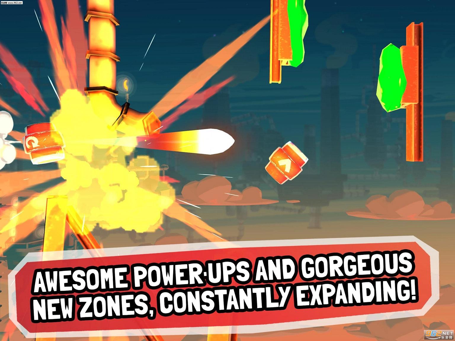 充满动感的游戏机制。试着避开小鸟、建筑物以及怪异的机器,以迅速点击的方式来闪躲那些快速移动的障碍物,精确瞄准下一个要前往的炮弹位置,或是直冲天际来避开各式各样的障碍物,迅速地前往目标。