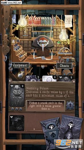 游戏中的卡牌种类还是非常丰富的,补充移动值或是获得装备合成材料的道具卡,守护财宝的各种守卫卡,以及改变环境的机关卡等等,每次行动都会随机到不同的卡牌,游戏变数相当大,玩家需要针对不同的情况改变自己的路线,当没有剩余的卡牌之后玩家即可从出口卡中逃出并完成游戏进入结算。