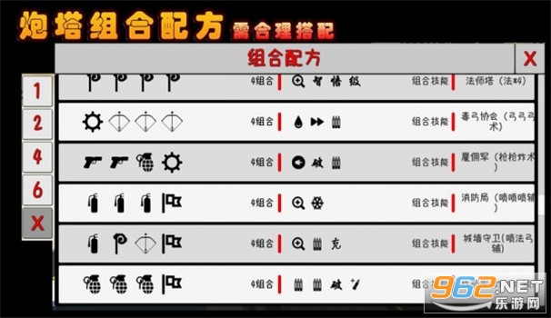 1 防御塔组合。特定建筑上建造特定防御塔,可获得额外技能加成。组合类型丰富。