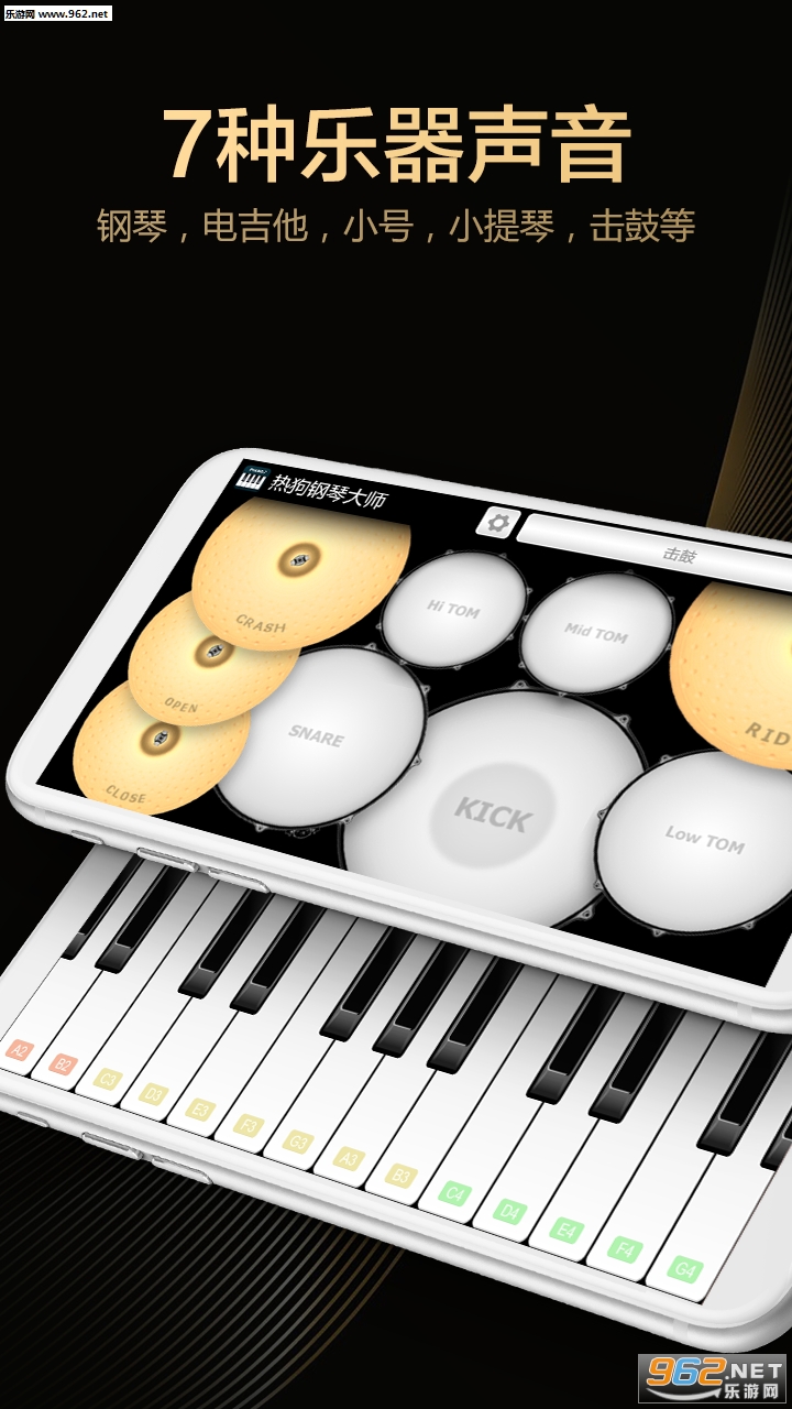 高品质多音色:原声钢琴,电钢琴,原声吉他,电吉他,小号,小提琴和架子鼓
