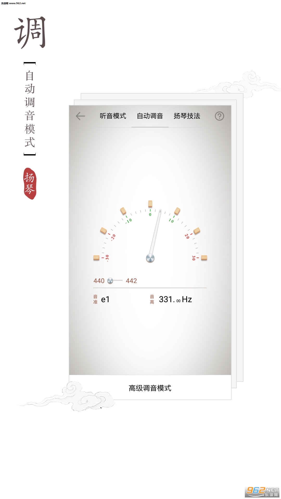调音器,提供:听音模式、自动定弦、扬琴技法,共3种调音模式;