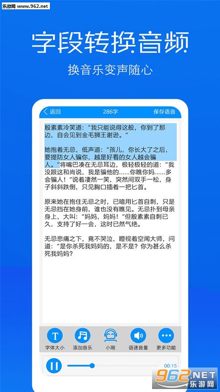 1.文字转语音:输入花样文字,智能文字识别,能调字体大小、添加背景音乐、语速调节,多种发音人选择,还能一键保存文本和录音;