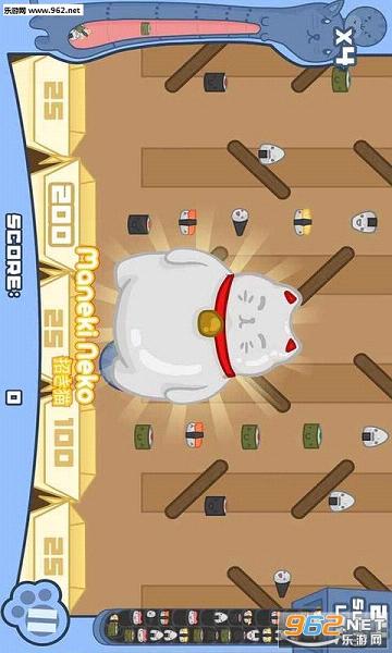 这是一个非常可爱的小游戏,蓝猫为了见心爱的粉猫一面,要狂吃寿司增肥,不然就要狂撞墙了!游戏适合不想动脑的同学,玩法相当简单,只要在限定的次数内合适的位置投下蓝猫,吃下足够多的寿司就过关(左侧有显示,要填满蓝猫的胃才行)。