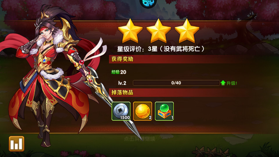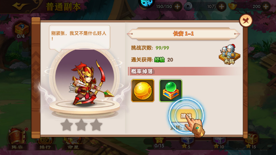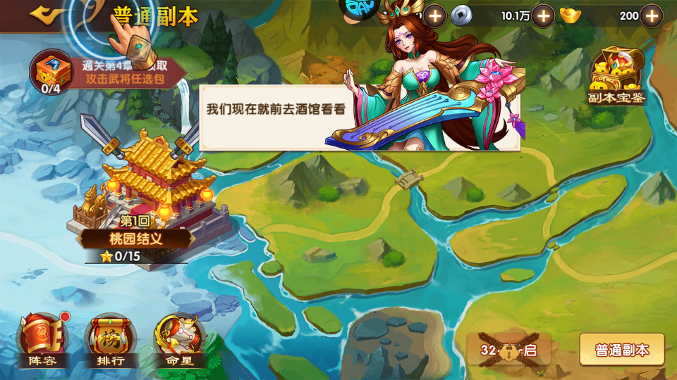 副本——副本是前期获得元宝的主要来源之一,因为前期的副本好打,每个章节达到4.8.12颗星星都可以开启宝箱,宝箱里面就有大量的金币。