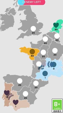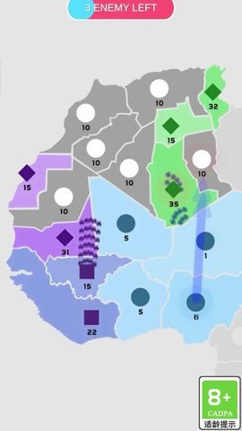 2、游戏之初,玩家会有少数已占领的领地,可以源源不断的生产出士兵,通过积攒士兵以及对地方操作的判断,在保住自己已占领的领地的情况下,合理出兵进行攻占敌方领地。