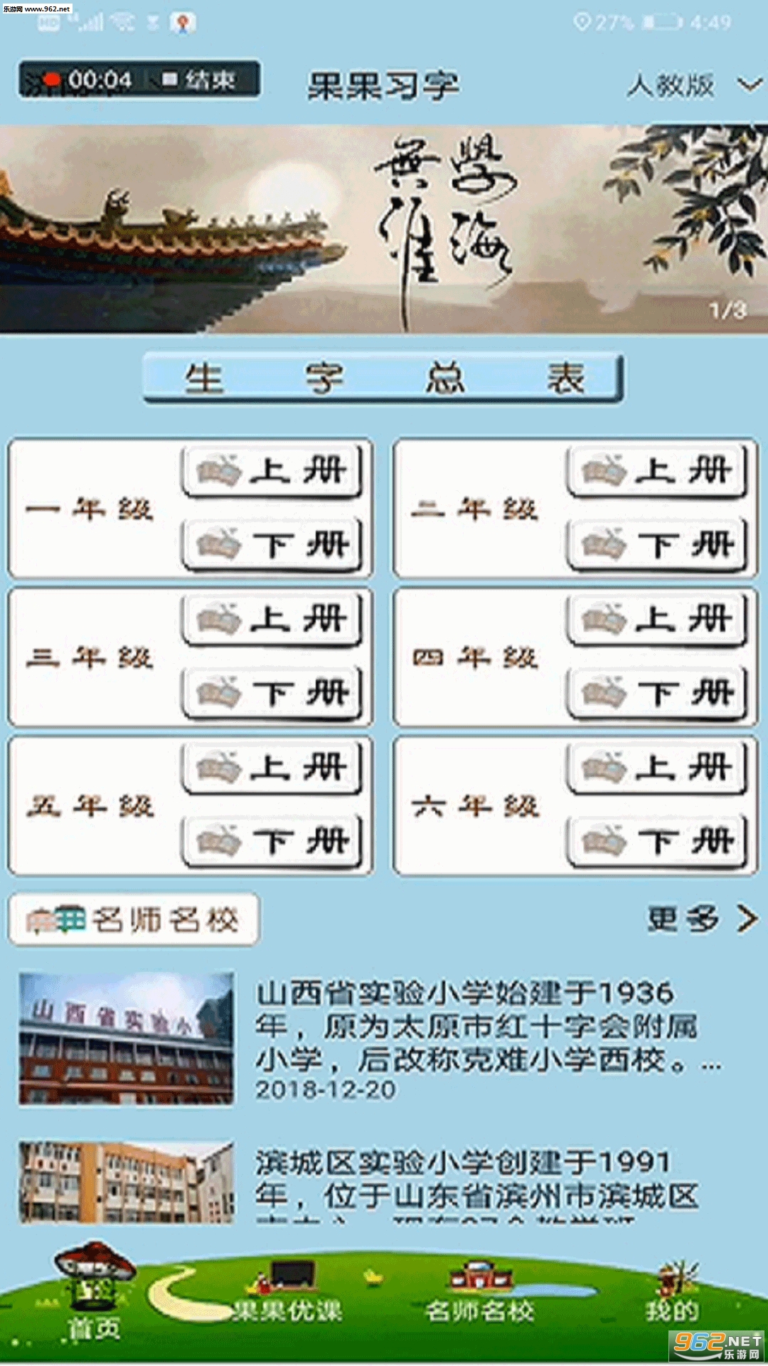 《果果习字安卓版》是山东晟世教育科技有限公司推出的一款识字写字软件,朋友们可以在果果习字app学习基础的汉字,可以练习钢笔毛笔字等,提高自己的书法水平。