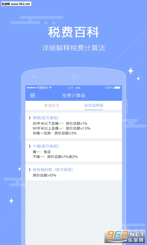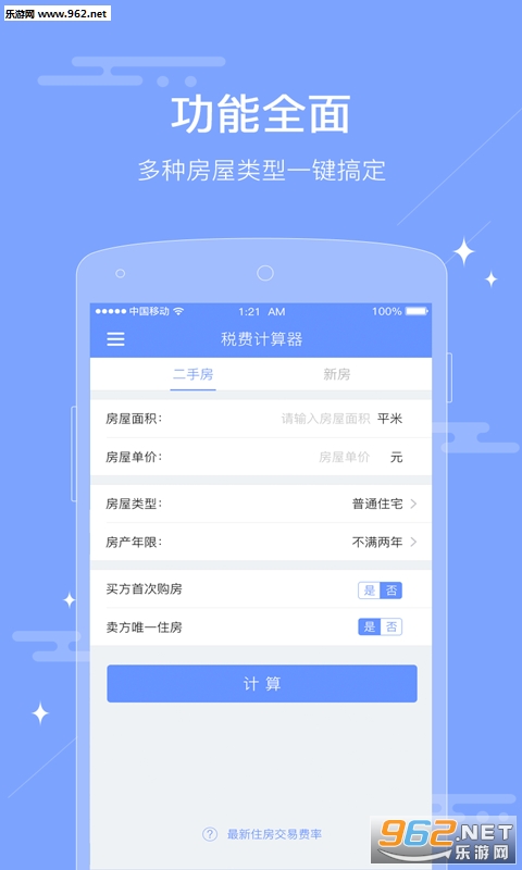 《房屋交易税费计算器app》是一款简单实用的计算房屋税费工具,帮助用户计算新房、二手房各种成交税费的计算,快速准确,操作简单便捷,结果技术精准,这款app软件页面简洁大方,内存占用小,需要的赶快下载试试吧!