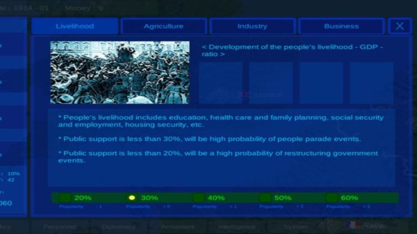 2、在游戏里你可以控制一个国家,通过调整政策来发展经济或是提高财政收入;
