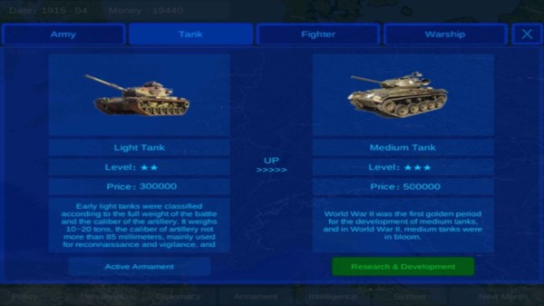第一次世界大战给人类带来了严重的灾难,但客观上推动了科学技术的发展。在游戏中,您可以通过调整政策来发展经济或增加收入,并获得足够的资金购买先进的军备,从而控制一个国家。当指定的城市获得足够的人力招募时,通过城市陆军移动指挥可以制定全球统一战略。