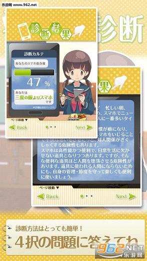 《禁断的手机依赖症诊断中文版》是一款手机爱意测试休闲小游戏。现代人离不开手机,每天你可以看见无数的人拿着手机低着头,手机真的有那么重要么?或者说手机到底有多重要?下载这款游戏,你可以测试一下你对手机的爱是否坚不可摧。不用担心看不懂噢,本版本已经破解了中文配音啦~让国内著名声优带着你一起通过测试吧!