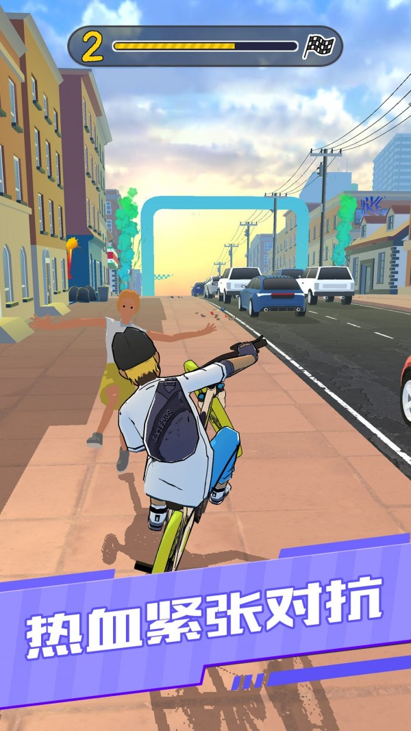 1、流畅的画面和操作,操控你角色驾驶自行车顺利的在不同的跑道上前行。
