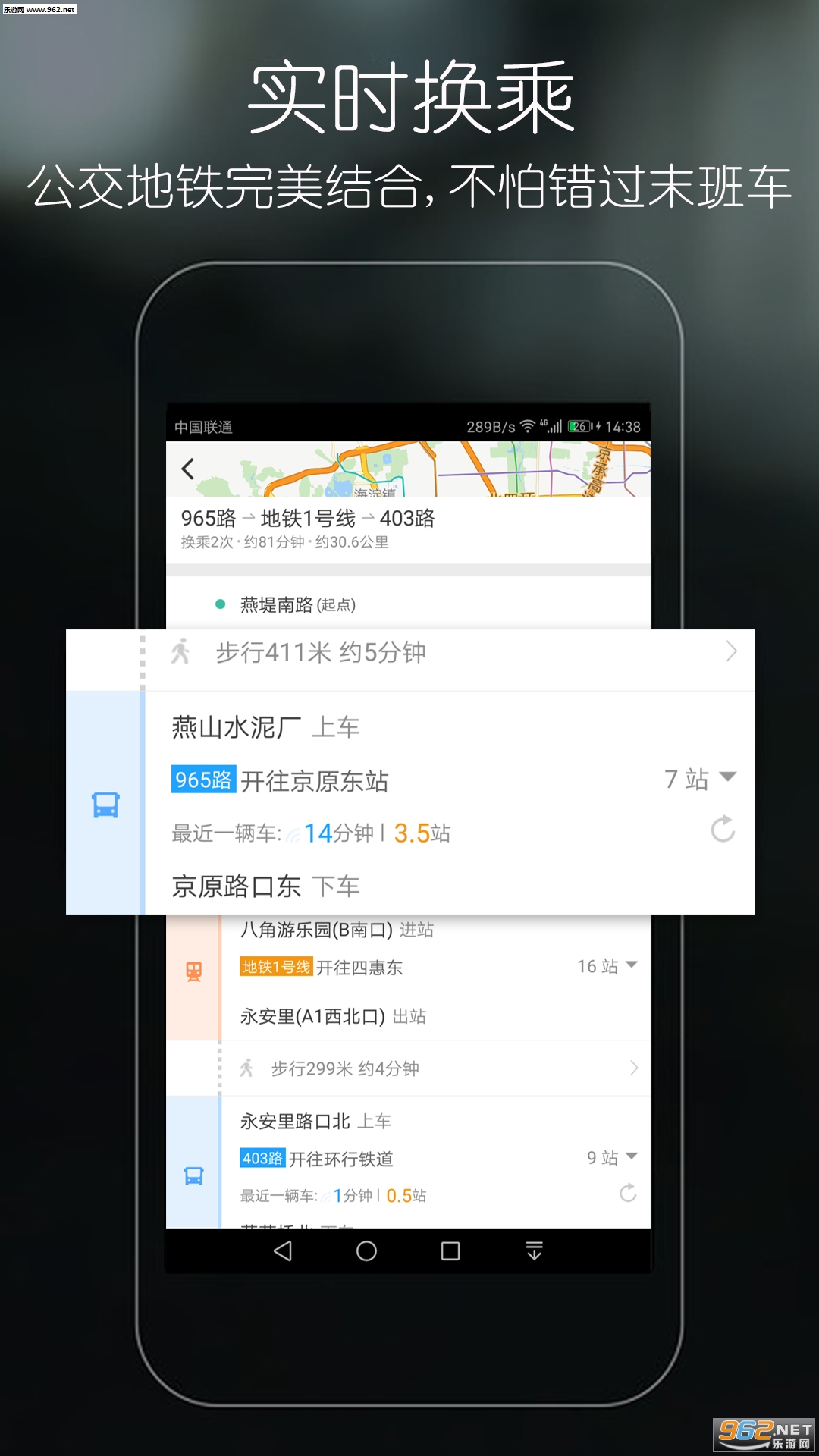 实时查看公交到站信息,便捷查询换乘路线,输入目的地,为您推荐最优的公交+地铁的换乘路线,告别盲目等车,从容出行。