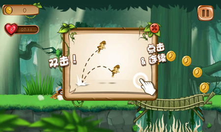 3、别样的藤蔓摇摆闯关在空中完成各式飞跃,解锁不同形象的猴子或猩猩。
