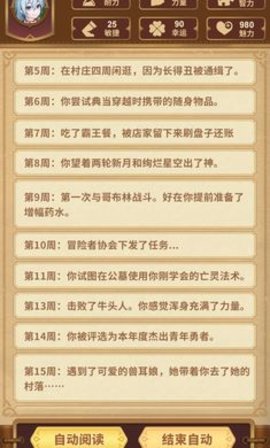 2,玩家可以明确的看到自己冒险全过程,以一周为单位,不同的周会有不同的文字,也可以选择自动阅读,快速略过自己的文字剧情。