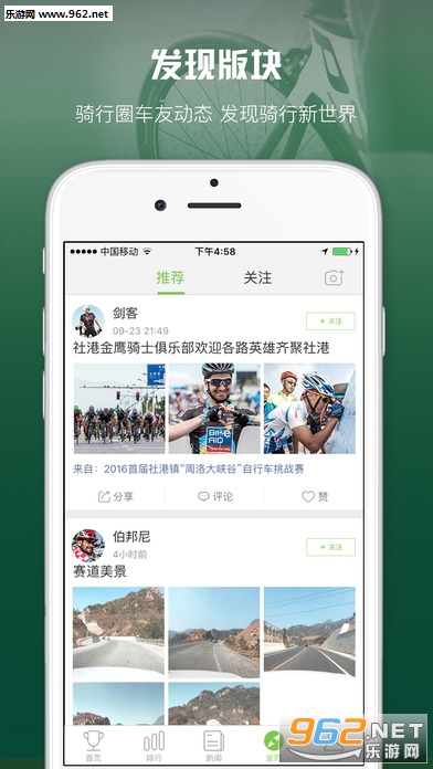 赛事动态、骑行花絮应有尽有,关注喜爱车友,点赞、评论、分享互动。