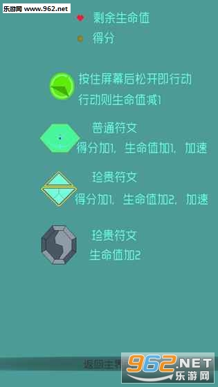 游戏玩法很简单,手指松开就会开始移动扣掉一点生命,吃到符文会加生命,有3种符文,2种加生命的同时也会加速,最好的不加速加2生命,看你可以活到多少分!