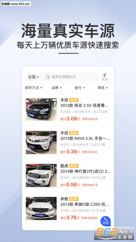 1、自助找车:根据品牌、车型、价格和车龄筛选车辆;关键字搜索;