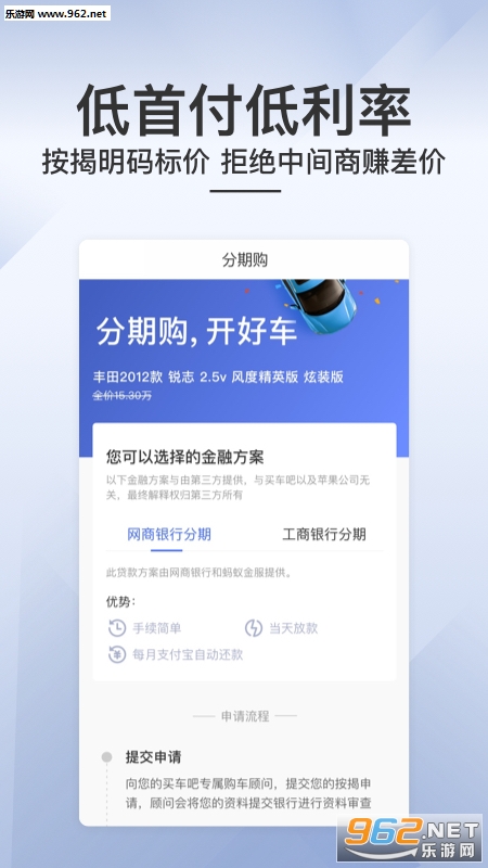 多种金融方案任选,低门槛低首付低利率,秒速放款当天提车,按揭费用明码标价,拒绝中间商赚差价