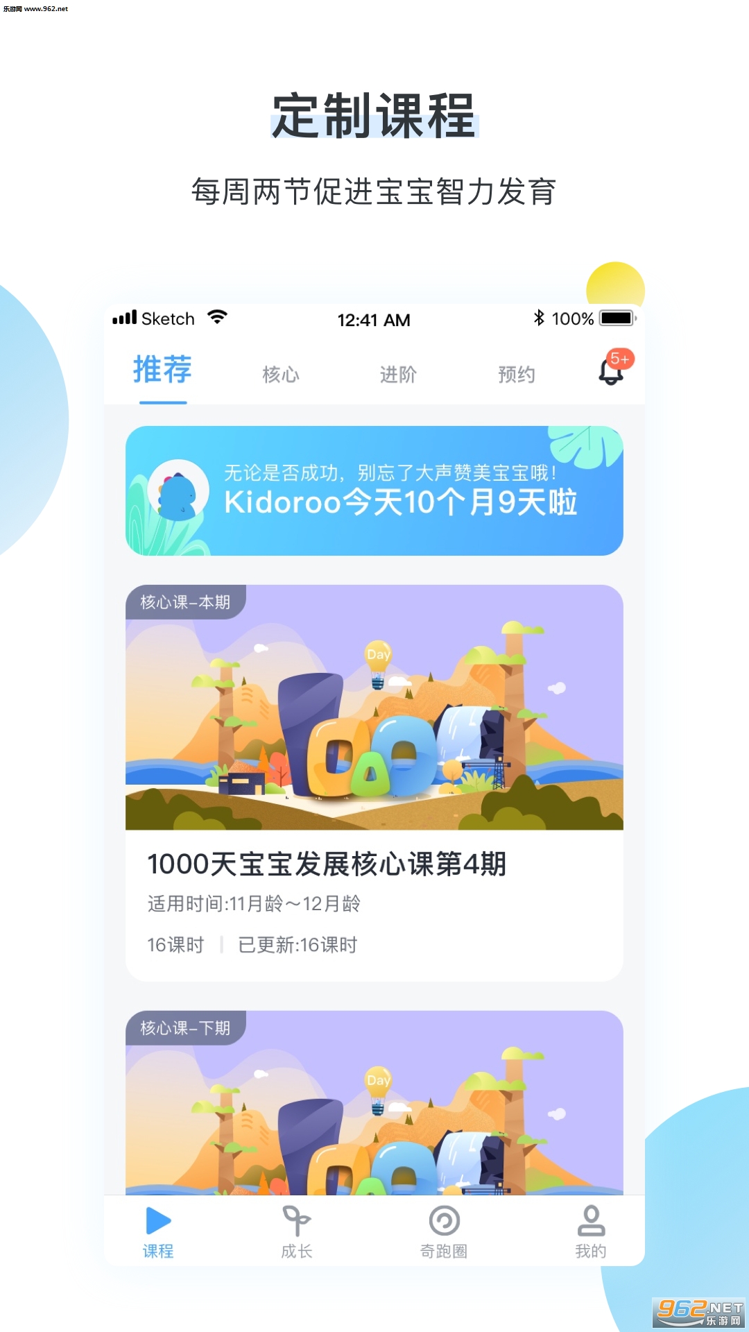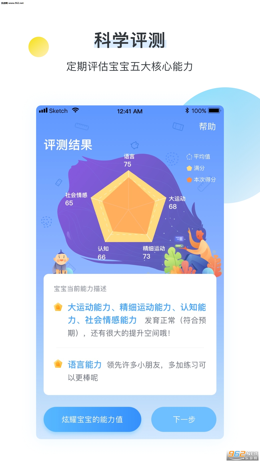 【核心课程】由多家国内外知名学府和科研机构多年潜心研究并验证有效的教育方法,通过科学全面的定期评测,详细解读宝宝的五大核心能力,并根据评测结果实时调整,推送有针对性的课程设置,为宝宝的成长保驾护航。