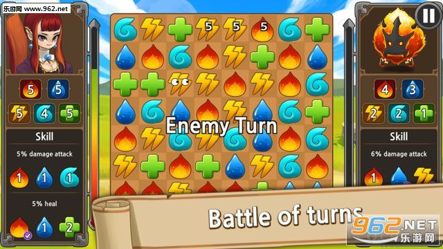 游戏中玩家要用消除的方式来击败遇见的怪物,随着玩家的升级各类型的伤害也会随之增高。
