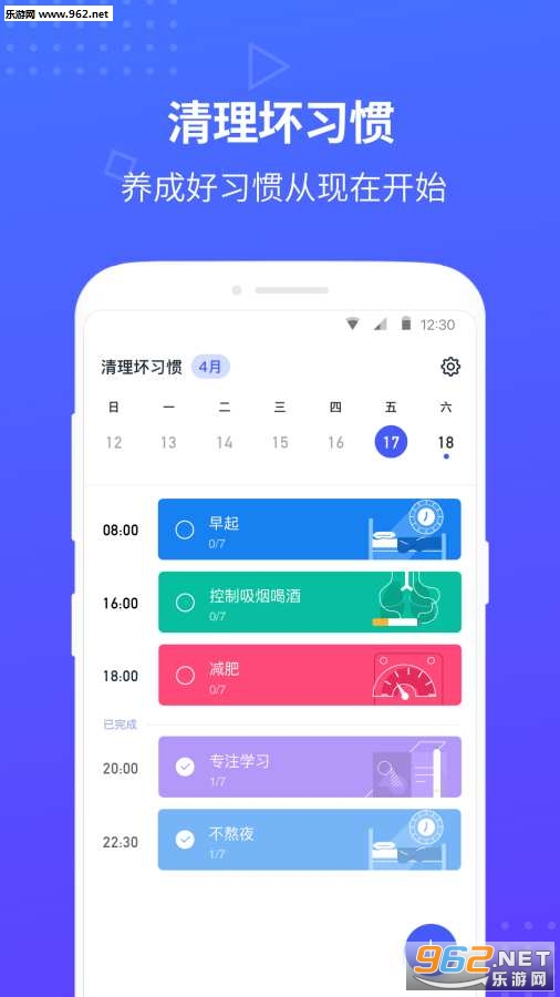 清理坏习惯(养成好习惯)是一款多功能习惯养成服务软件,帮助用户改善生活中不好的习惯,拥有多种坏习惯标签可以推荐,也可以自由添加属于自己的坏习惯,然后指定改善计划和坚持时间,能够督促用户完成任务,改掉坏的习惯,养成好习惯,使用方法简单,赶快下载使用吧!