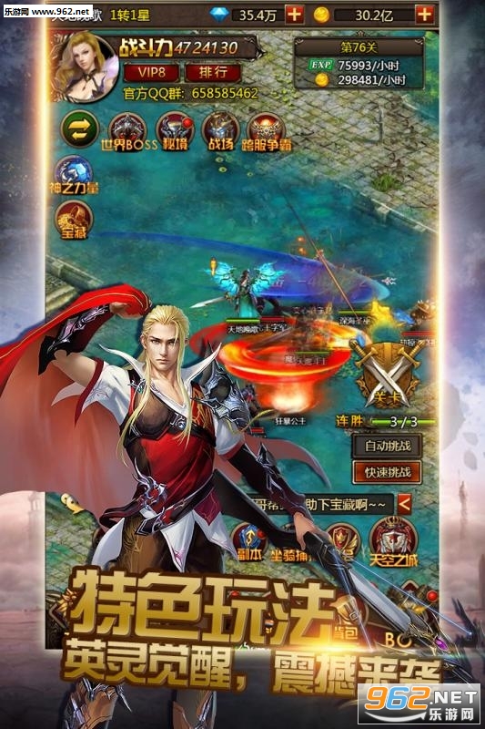 千人国战,万人跨服PK,紧张刺激,让你体验不一样的PK节奏感!!炫丽技能、华丽时装、超高属性装备,等待你来体验!