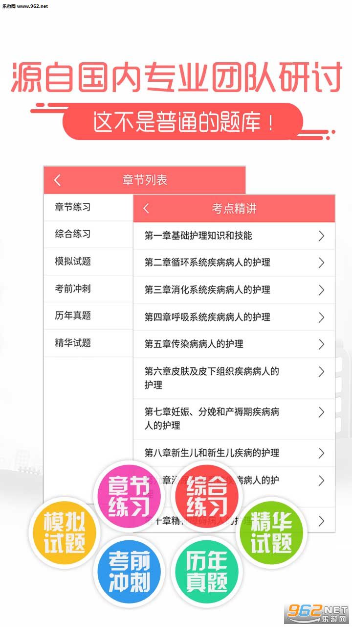 适用于护理学(护师)考试,软件试题库设计紧扣最新护理学(护师)考试大纲、考试教材,符合护理学(护师)考试考试题型与考试科目,复习辅导资料、考试资料丰富,免费试用、试题库巨大(注册版试题量达1万3千多题),辅导软件收录护理学(护师)考试章节练习、综合练习、模拟试题、考前冲刺、历年真题