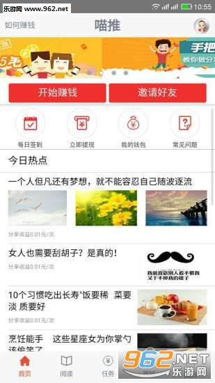 喵推是一款让你玩阅读新闻资讯还可以赚钱的平台,你只要按照提示下载注册喵推app并分享文章,就能够获得注册、分享等奖励。喵推app为您推送好玩的文章和视频,您可以在朋友圈分享我们为您推送的搞笑,娱乐,养生,理财等文章。