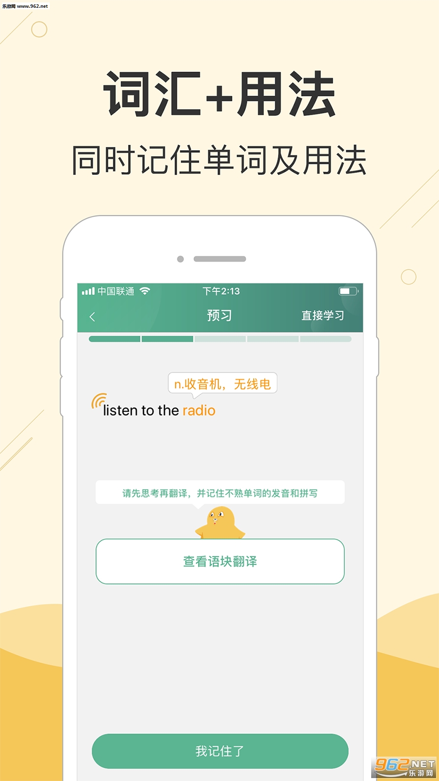 块块英语采用“语块学习法”,让用户记住4-8个单词的词汇用法,不再无效背单词,同时提高听力理解速度和口语流利度。