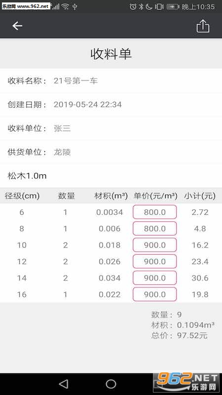 实用的木材行业工具,简洁的界面,输入方便,快速材积计算,结果根据径级分级清晰明了;可设置不同树种不同长度不同径级的价格,最终快速计算总价,分类清晰结果明确,可分享计算结果;集成了国标材积表,方便随时查询。