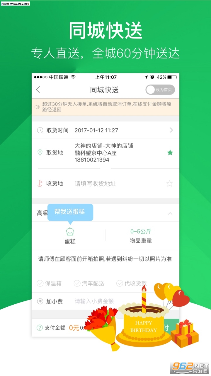 即时送:送蛋糕、送鲜花、送文件、取钥匙、取证件,专人闪送,24小时服务,想送啥就送啥。