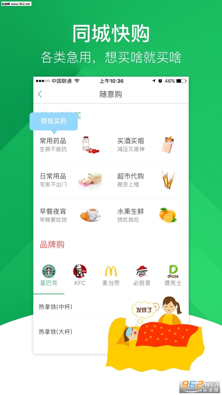 同城代买:早餐夜宵、啤酒烤串、水果生鲜、超市药店、各类急用,全城帮买,急速送达。