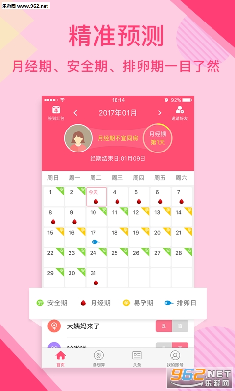 2.记录月经期日期,我们自动帮您推算大姨妈月经期、排卵期以及安全期。