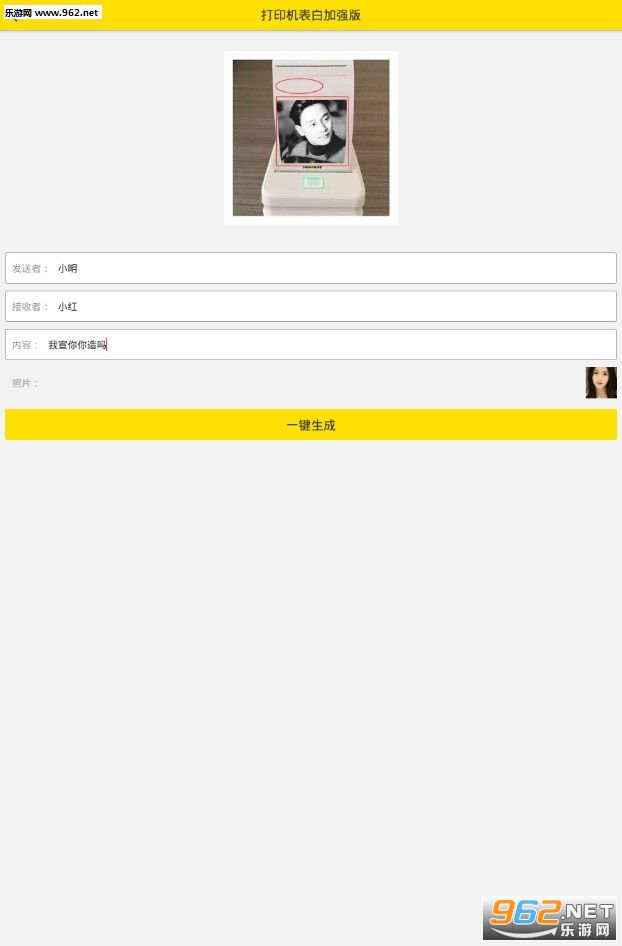 《打印机表白生成器加强版》是一款朋友圈非常火爆的打印机上表白生成器,相对你喜欢的人或仰慕很久的人进行表白吗?快来下载本款软件,输入自己的名字和对方的名字一键生成打印机表白图片。