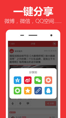 一键转发到短信、QQ、QQ空间、、腾讯、新浪、豆瓣、朋友圈、人人网,随时随地分享快乐!