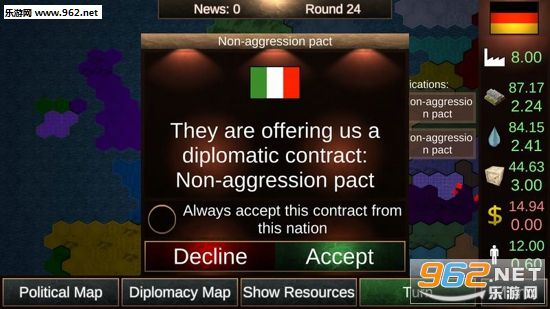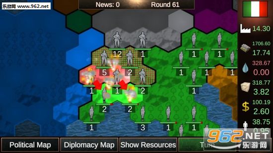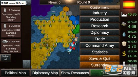 游戏画面简洁,内容丰富,玩家在游戏中需要选择一个国家作为你的基地,并带领它走向富强繁荣的道路,你需要发展本国的经济文化,和周边的国家建立有好的外交政策,加大国家之间的贸易文化交流,同时不断地提升国家的军事实力,让其他国家不敢对你的国家轻易出兵,只有你们足够强大才能威慑其他国家。