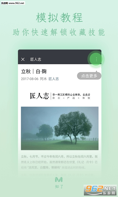 【分享收藏】阅读文章时,遇到想要收藏的文章,可以通过点击分享按钮,找到系统入口,并发送至知了收藏,即可对文章进行收藏。