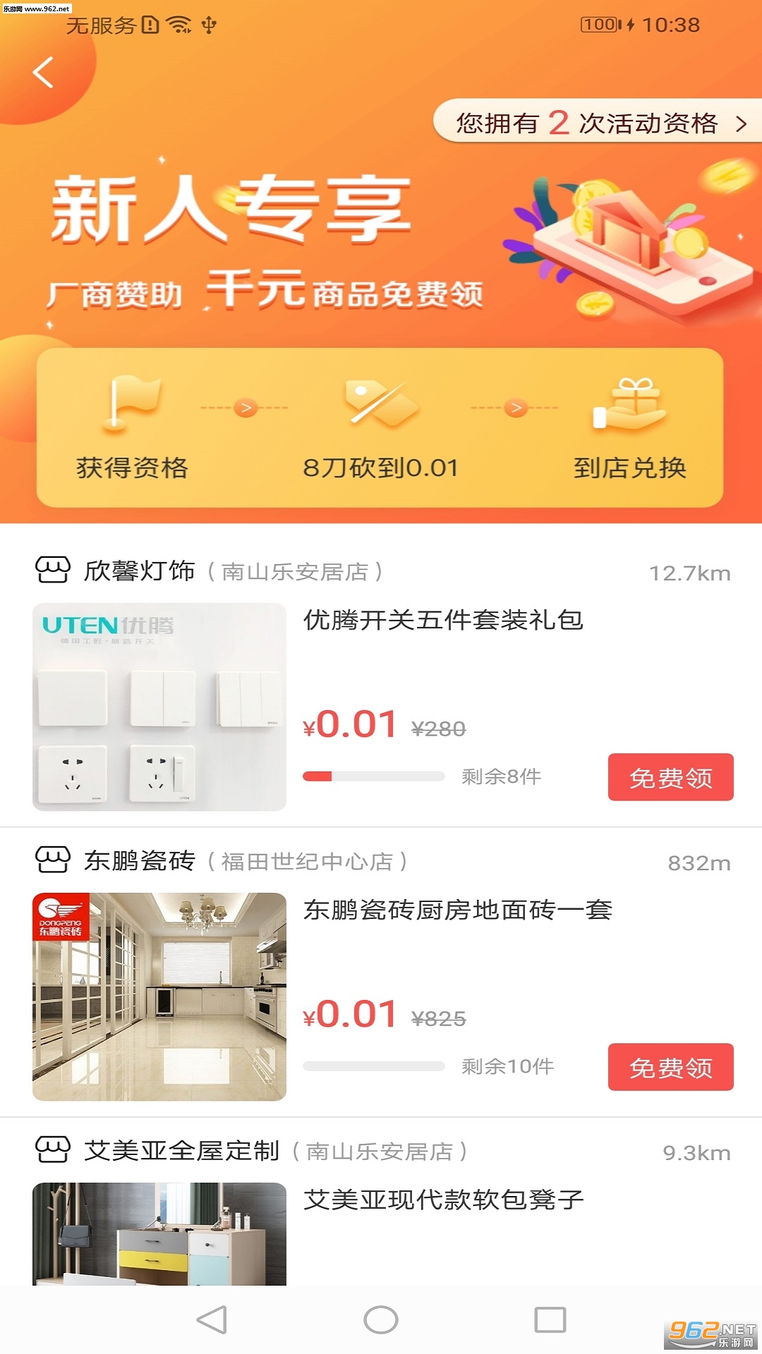 新人福利是平台新人专享的活动,新人下载及注册即可获赠送活动资格,在新人专区选择商品,使用资格开启新人任务,完成任务就可以获得商品兑换码,最后凭兑换码到门店免费兑换相应的超值家装商品。