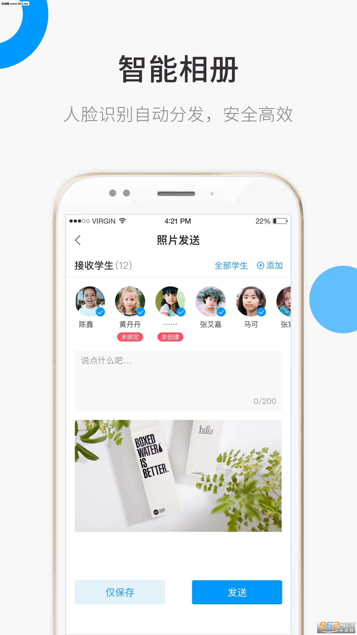 只需要拍照点击发送,自动人脸识别分发给各自家长