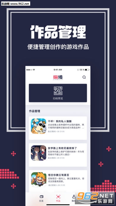 一款专业的游戏社交软件,在这里不仅有海量的游戏供用户选择,还有更多的游戏资讯,让你了解最新的游戏动向,专属的互动交流社区让你结识更多好友!唤境支持原创作品上线!给你不一样的游戏新体验。