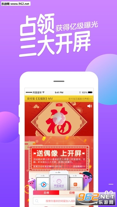 用户选定支持的偶像后,每抽中一张五福增强符,相应偶像也增加了增强符数,偶像会按照队伍当日获得增强符数量排名,获得相应的分数。活动排位首位的偶像可在2026立春独享阿里星球、优酷视频、虾米音乐开屏,获得亿次曝光