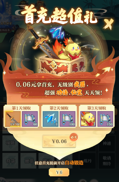 ★【首充活动】首充0.06元可获取60级极品武器,提前开启自动锻造