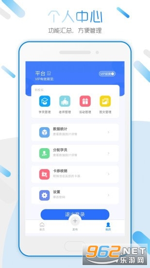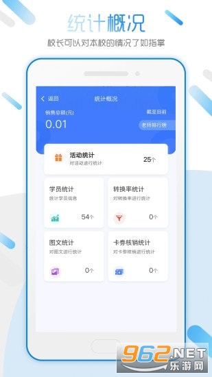 1、是一款专业的培训机构招生软件,这里提供了发布课程、发布卡券、发布拼团、数据统计等功能;