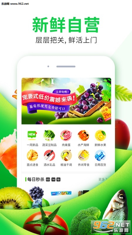 新鲜蔬菜、肉禽蛋类、水产海鲜、生活百货、酒水饮料、休闲零食、粮油干。